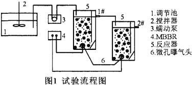 該項目的廢水處理工程計劃采用厭氧反應器和好氧反應器串聯(lián)的工藝,本研究為好氧單元的小試試驗,采用二級移動床生物膜反應器(MBBR)處理模擬厭氧反應器出水,初步考察MBBR對該廢水的處理效果并摸索工藝條件。