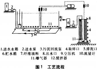 反應(yīng)器由5mm厚的有機(jī)玻璃制成,DAT-IAT池尺寸為900mm×400mm×300mm,有效容積為97.2L。IAT池后側(cè)設(shè)有6個(gè)排水口,底部設(shè)有排泥口。生物膜反應(yīng)器的外簡(jiǎn)直徑為250mm,高為650mm,有效容積為29.5L;內(nèi)簡(jiǎn)直徑為100mm,高為600mm,底部開(kāi)有直徑為10mm的小孔l2個(gè)。充氧后的污水沿內(nèi)筒向上流動(dòng),至頂部后進(jìn)入內(nèi)外筒之間的纖維填料區(qū)(高為500mm),然后再經(jīng)底部小孔重新流入內(nèi)筒,實(shí)現(xiàn)了污水的循環(huán)流動(dòng)。生物膜反應(yīng)器一側(cè)設(shè)排水口1個(gè)、取樣口5個(gè),底部設(shè)排泥口1個(gè)。DAT-IAT池及生物膜反應(yīng)器均采用微孔曝氣。工藝流程見(jiàn)圖1。