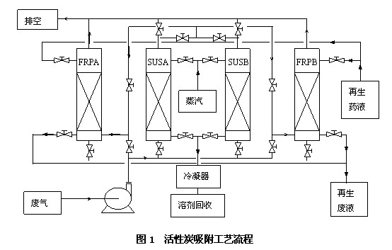 廢氣由風(fēng)機逆流先分別通過SUSA和SUSB,然后分別通過FRPA和FRPB,經(jīng)凈化后排出。四個塔分別設(shè)有再生接口和管路。市售國產(chǎn)炭和IVP炭采用堿液再生,BPL炭用蒸氣再生。