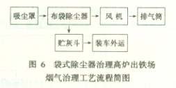 高爐在開爐、堵鐵口及出鐵的過程中將產(chǎn)生大量的煙塵。為此,在諸如出鐵口、出渣口、撇渣器、鐵溝、渣溝、殘鐵罐、擺動流嘴等產(chǎn)塵點設置局部加罩和抽風除塵的一次除塵系統(tǒng);在開、堵鐵口時,出鐵場必須設置包括封閉式外圍結構的二次除塵系統(tǒng)。除塵器可采用濾袋除塵器等。圖6是出鐵場煙氣處理工藝流程。