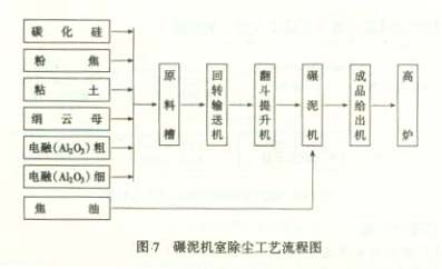 高爐堵鐵口使用的炮泥由碳化硅、粉焦、粘土等粉料制成。在各種粉料的裝卸、配料、混碾、裝運的過程中將產(chǎn)生大量的粉塵。治理這些廢氣可設置集塵除塵系統(tǒng),除塵設備可采用袋式除塵器收集粉塵。圖7是碾泥機室除塵工藝流程圖。