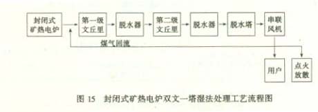 ①“雙文一塔”濕法凈化法 該法是挪威技術(shù)。它采用兩級文丘里洗滌器和一級脫水塔對廢氣加以凈化,凈化效率高。圖11-15是封閉式礦熱電爐雙文一塔濕法處理工藝流程。