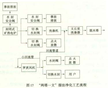 ②“洗滌機(jī)”濕法凈化法 該流程是德國馬克公司的凈化工藝。其洗滌設(shè)備主要為多層噴嘴復(fù)噴型洗滌塔及蒂森型煤氣洗滌機(jī)。圖16是封閉式礦熱電爐洗滌機(jī)濕法凈化爐氣的工藝流程。