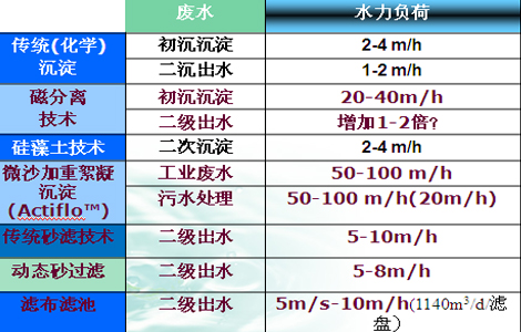 傳統(tǒng)的沉淀原理非常簡(jiǎn)單,顆粒如果在出水前沉淀到出水管之下即被去除,而沒(méi)有沉淀的顆粒就被水流帶走,因此導(dǎo)致初沉池的水力負(fù)荷為2-4m/h、二沉池的水力負(fù)荷是1-2m/h,磁分離(Comag)技術(shù)、硅藻土技術(shù)、ActifloTM技術(shù)都是通過(guò)載體增加了絮體的比重,強(qiáng)化了分離效果。磁分離技術(shù)主要是通過(guò)投加混凝劑和磁種,由于磁種的重力作用達(dá)到絮凝物高效沉淀;硅藻土具有兩個(gè)功能,一是微孔吸附(整個(gè)尺寸在30μm-50μm,且微孔尺寸小于1μm),二是硅藻土中含有鋁、鐵等重金屬元素具有混凝的作用;ActifloTM技術(shù)是在絮體間投加了微砂合成大顆粒絮體,加快污染物的沉淀速度;這三種技術(shù)的原理都是增加比重,可以說(shuō)代表了沉淀技術(shù)方向的進(jìn)展。