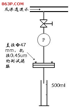 測(cè)試如下:首先應(yīng)充分排除過(guò)濾池中的空氣壓力,使給水以30psi 的恒定壓力通過(guò)直徑為Φ 47mm 、孔徑為0.45um的測(cè)試濾膜后開(kāi)始測(cè)定:首先測(cè)定開(kāi)始通過(guò)濾膜的500毫升水所需要的時(shí)間T0;在使水連續(xù)通過(guò)濾膜15分鐘(T)后,再次測(cè)得通過(guò)濾膜的500毫升水所需要的時(shí)間T1;在取得以上3個(gè)時(shí)間數(shù)據(jù)之后,由此可以計(jì)算出該水源的SDI值: