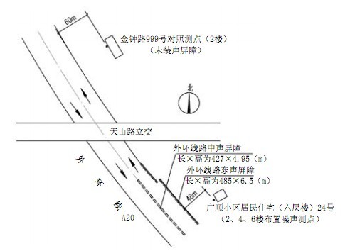 廣順小區(qū)段:廣順居民住宅小區(qū)位于外環(huán)線天山路立交的南側路東。居民樓距外環(huán)線車行道邊線約48m,在外環(huán)線路東及中間隔離帶東側安裝道路聲屏障,總長約885m,其中路東側聲屏障長×高約為458×6.5(m),路中聲屏障長×高約為427×4.95(m)。