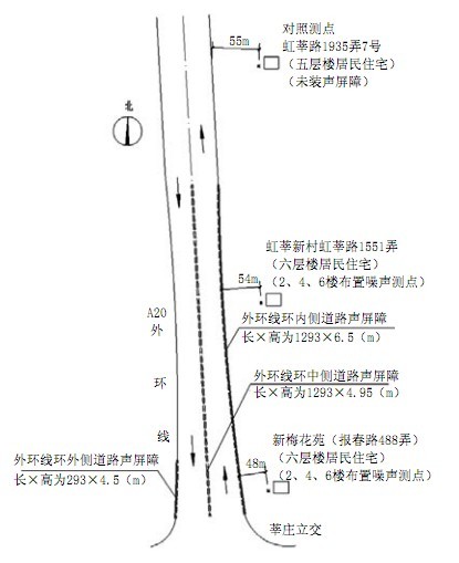 新梅花苑和虹莘新村段:在外環(huán)線莘莊立交北部東側,居民住宅距外環(huán)線車行道邊線約48m,在外環(huán)線的環(huán)外側、環(huán)中側、環(huán)內側安裝總長約2879m的聲屏障,其中環(huán)外側長×高約為293×4.5(m),環(huán)中側長×高約為 1293×4.95(m),環(huán)內側長×高約為1293×6.5(m)。