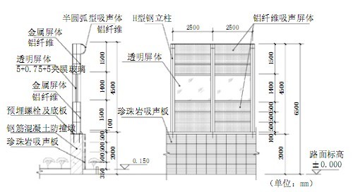 為防止屏障漏聲,凡有縫隙的地方都用水泥漿填實,屏體之間的空隙用玻璃硅膠填充密實。圖3為聲屏障的結構示意圖。