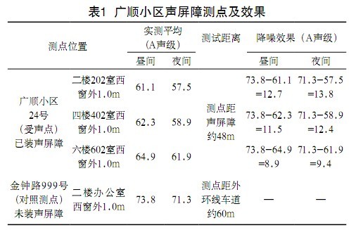 廣順小區(qū)24號為六層樓居民住宅,距聲屏障約 48m。在二、四、六層樓上布置監(jiān)測點(受聲點),實測安裝聲屏障后的A計權聲級。為評價聲屏障的降噪效果,在同一路段的北側未裝聲屏障的金鐘路999號二樓西窗外布置對照監(jiān)測點,對照監(jiān)測點距外環(huán)線約60m,同步測試的結果列于表1。