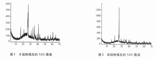 制備抗鹽鹵水泥所用石灰石、粘土、二水石膏、鐵粉、粉煤灰等原材料均由青海省新型建材工貿(mào)有限責(zé)任公司提供。試驗所用粉煤灰為青海省橋頭電廠的濕排粉煤灰 (Ⅲ級)和一部分經(jīng)電收塵器收集的Ⅱ級粉煤灰。由 XRD分析可知(圖 1、圖 2), 粉煤灰的 XRD圖譜在 20~30°的區(qū)域內(nèi)出現(xiàn)比較寬大的衍射特征峰, 表明有較多非晶態(tài)的玻璃體存在。與 Ⅱ級粉煤灰相比 , Ⅲ級粉煤灰中非晶態(tài)物質(zhì)含量少 , 化學(xué)活性不及Ⅱ級粉煤灰。因此 , 本研究中利用粉煤灰鋁含量高的特點 , 采用活性低、含碳量高的 Ⅲ 級粉煤灰作原材料替代鋁礬土生產(chǎn)含硅酸三鈣(C3S)和無水硫鋁酸鈣相 (C4A3 )的熟料; 將活性較高的Ⅱ級粉煤灰細磨處理后用作混合材以改善抗鹽鹵水泥的性能, 綜合提高水泥中粉煤灰的利用率。