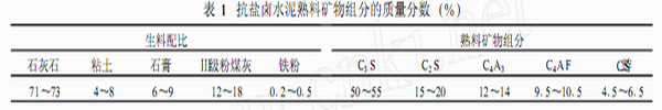 根據(jù)抗鹽鹵水泥的性能要求, 采用正交設(shè)計優(yōu)化理論確定抗鹽鹵水泥熟料的礦物組成?果}鹵水泥生料配比和熟料礦物組成見表1。