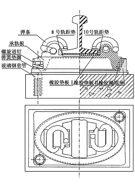 軌道減振器扣件為全彈性分開式,三階減振,它由金屬承軌板、底座與橡膠圈硫化為一個(gè)整體,橡膠圈承受壓力與剪力,具有橫向和垂向彈性。