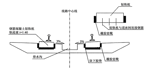 彈性短軌枕式整體道床由兩個(gè)獨(dú)立的短軌枕、彈性鋼軌扣件和軌下彈性墊板及混凝土道床等部分組成。短軌枕外設(shè)橡膠套提供軌道的縱、橫向彈性變形, 具有較好的噪聲和振動(dòng)衰減特性,彌補(bǔ)了無碴軌道剛性大的缺陷。但是,在高架橋上使用這種軌道結(jié)構(gòu),當(dāng)高溫暴曬和雨水或臟物進(jìn)入橡膠套靴內(nèi)部時(shí)可能對(duì)結(jié)構(gòu)性能或壽命產(chǎn)生不利影響。