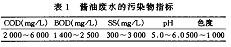 醬油廢水的主要成分包括糧食殘留物、發(fā)酵過(guò)程產(chǎn)物、醬油色素、微量洗滌劑、消毒劑、大量的鹽分、各種微生物及微生物的分泌物和代謝產(chǎn)物。廢水具有較高的BOD,COD,SS和色度,廢水BOD5/COD大于0。5,易于生物降解。醬油廢水的主要污染物指標(biāo)如表l所示。