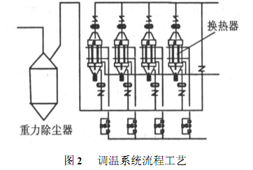 干法除塵所選用的濾袋能承受的最高溫度大概為280 ℃ 左右 ,而進(jìn)入濾袋除塵器的煤氣溫度下限應(yīng)高于露點(diǎn)30 ℃,因此 ,為防止溫度超高燒損濾袋或因溫度低而粘結(jié)濾袋 ,有效地控制進(jìn)入箱體的煤氣溫度對布袋除塵器的正常運(yùn)行是極為重要的。大中型高爐在操作中正常煤氣溫度在120- 210 ℃ 之間 ,如出現(xiàn)爐況不順時煤氣溫度偏高的情況多于偏低的情況 ,目前國內(nèi)通常采用調(diào)溫系統(tǒng)來控制煤氣溫度以利除塵系統(tǒng)的運(yùn)行 ,其工藝流程如圖2。