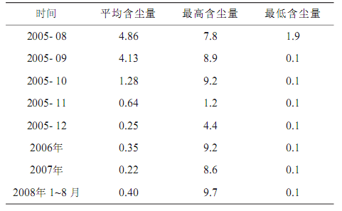 高爐煤氣除塵器運(yùn)行如何,關(guān)鍵看除塵后的煤氣含塵量,以韶鋼為例,2005 年 8 月至 2006 年 8 月除塵后的煤氣含塵量如下表。