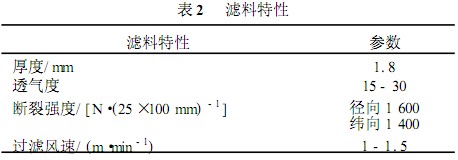 經(jīng)除塵器過濾后的煤氣質(zhì)量濃度一般保持在3 - 5 mg/ m3致使煤氣質(zhì)量較高的原因主要是由濾料特性決定的。目前選用的濾料為氟鎂鍶針刺氈 ,其主要特性見表2。
