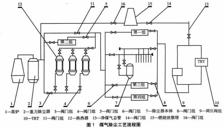 如圖 1 高爐產(chǎn)生的煤氣經(jīng)粗除塵器 (重力除塵),如爐頂煤氣低溫高濕,煤氣通過燃燒放散塔放散;如爐頂煤氣溫度小于 300攝氏度,煤氣送布袋除塵器;如爐頂煤氣溫度大于 300攝氏度,煤氣需經(jīng)過爐頂打水或通過降溫裝置將煤氣溫度降至 300攝氏度以下,再送到布袋除塵器進(jìn)行過濾,凈化后的煤氣送到TRT 將壓力降為 10 kPa 左右送至管網(wǎng)。