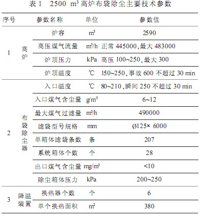 2500 m3高爐全干法布袋除塵器設(shè)計(jì)負(fù)荷為49 000 萬 m3/h 運(yùn)行煤氣壓力為 150~250 kPa 其主要技術(shù)參數(shù)見表1。