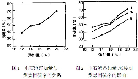 從圖1可知電石渣對型煤的固硫能力隨電石渣添加量的增加而提高。但注意必須控制電石渣的添加量不能過大 ,以免影響型煤的燃燒狀況和熱損失。圖2中 ,1、 2、 3 條曲線代表電石渣粒度越來越大。反映出電石渣的粒度對固硫效果有一定影響。電石渣粒度越小 ,固硫能力越強。所以增加電石渣的比表面積有利于提高固硫率。