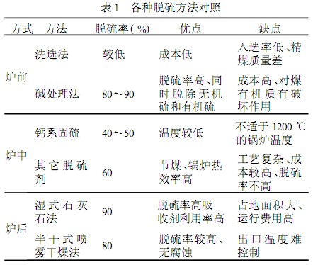 脫硫技術(shù)可分為爐前、 爐中、爐后3種方式 ,各種脫硫方法對照見表1。