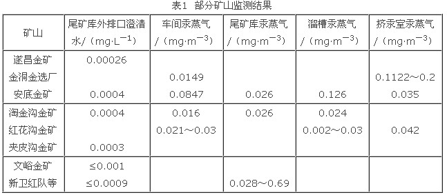 在用混汞法生產(chǎn)黃金過程中,混汞、洗干、擠汞、涂汞、蒸汞、冶煉等作業(yè)的周圍,由于汞本身的揮發(fā)性強,汞暴露于空氣中機率多,所進(jìn)行操作場地四周環(huán)境都不同程度存在著汞蒸氣污染。由于汞的物理,化學(xué)性質(zhì)所決定,汞蒸氣和水中汞的污染程度是不同的。由表1中可以看出,空氣中汞蒸氣有高度擴散性和較高的脂溶性,當(dāng)人吸入后可被肺泡完全吸收,并通過血液循環(huán)運載全身,因此長期工作在汞蒸汽環(huán)境中會引起汞中毒。