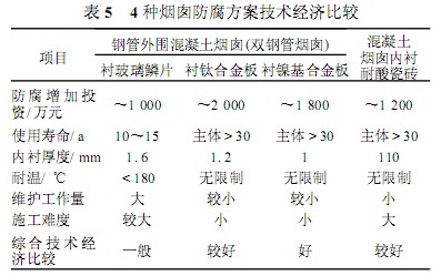 濕法煙氣脫硫裝置不設(shè) GGH 時(shí) ,煙囪需要采用防腐措施 ,防腐方案主要有: (1)在混凝土煙囪內(nèi)襯耐酸瓷磚; (2)鋼管煙囪內(nèi)表面襯玻璃鱗片、 鈦合金板或鎳基合金板。表 5 是 4 種煙囪防腐方案的技術(shù)經(jīng)濟(jì)比較。