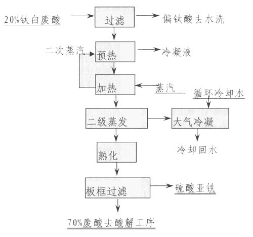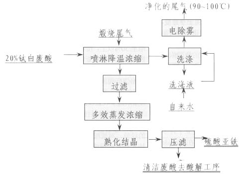 我國原化工部第三設(shè)計院和涂料研究所于20世紀(jì)80年代初曾在南京、鎮(zhèn)江等地建立了廢酸濃縮中試生產(chǎn)裝置,采用的流程是先把20%左右的廢酸進(jìn)行沉降凈化,然后采用真空濃縮的辦法將廢酸濃縮至30%以上,接著在0~5℃下冷凍,使廢酸中的鐵鹽以七水硫酸亞鐵的形式析出,同時廢酸濃度可以提高到40%左右。后來在此基礎(chǔ)上又增加第二段濃縮使廢酸濃度提高到65%,但因七水硫酸亞鐵脫水生成的一水硫酸亞鐵堵塞蒸發(fā)器的列管未能投入工業(yè)化生產(chǎn)。