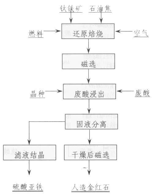 如圖4所示,典型的石原工藝流程包括四個步驟:(1)弱還原焙燒;(2)浸出富集;(3)干燥;(4)磁選。某些石原法處理過程中,在弱還原焙燒前還有預(yù)浸出過程,使其中的鐵至少一部分溶解而鈦不溶解。一般只能溶解除去10%~20%的鐵。弱還原焙燒過程是在石油焦或煤的作用下,控制處原氣氛,使三價鐵只還原到二價鐵而不是金屬鐵。在用廢酸進(jìn)行浸出富集時,關(guān)鍵是要控制好條件,以減少少鈦的溶解損失,并使產(chǎn)物的粒度能夠保持較粗粒度,以便能夠用于氯化法生產(chǎn)。酸濃度一般為200~600g/L。