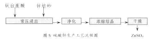 以鈦白廢酸和鋅焙砂(主要成分為ZnO)為原料,在一定工藝條件下進(jìn)行浸出反應(yīng),浸出液經(jīng)凈化后濃縮結(jié)晶得到ZnSO4產(chǎn)品。主要反應(yīng)原理為: