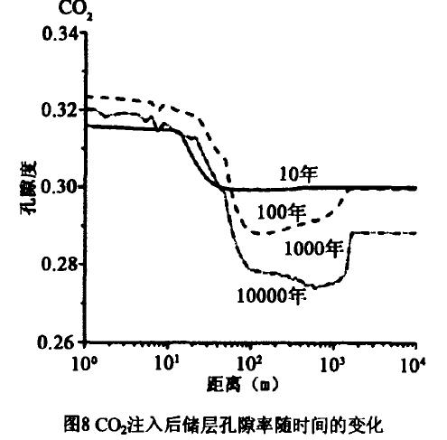 的變化非常敏感。應(yīng)用反應(yīng)性遷移模型對(duì)某長(zhǎng)石砂巖儲(chǔ)層(深度2km,75oC)注入帶CO2所致礦物蝕變的研究表明儲(chǔ)層孔隙率變化和CO2捕獲。注入CO2引起的礦物蝕變導(dǎo)致孔隙率改變。在酸化帶,礦物溶解起主要作用,孔隙率顯著增加;在CO2捕獲帶,CO2以次生礦物形式捕獲與巖石骨架,孔隙率減小。溶解C02的遷移和礦物蝕變通常使孔隙率減小,在外圍產(chǎn)生低滲帶,影響儲(chǔ)層的增長(zhǎng)和壽命。而大量CO2可通過(guò)碳酸鹽礦物的形式封存(如下圖8)所示。