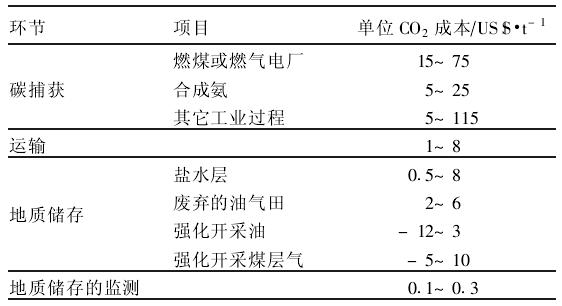 在碳捕獲和存儲的3個環(huán)節(jié)即捕獲分離、運輸、存儲中,捕獲分離的成本在總碳捕獲和存儲成本中占的比例最大,具體見下表。