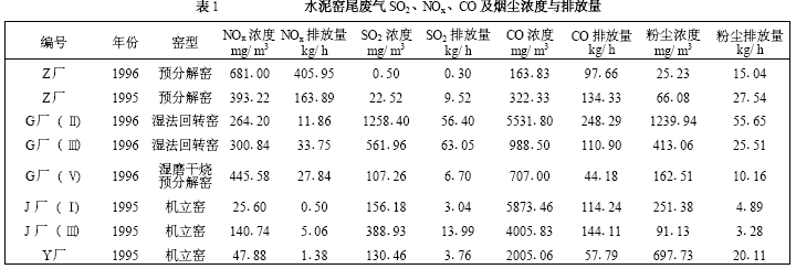 我們通過對華南地區(qū)多家水泥廠的調研, 深感水泥窯有害氣體的污染問題應引起足夠的重視, 表1 為有代表性的幾種水泥窯廢氣的SO2 、NOx 、CO及煙塵濃度與排放量。