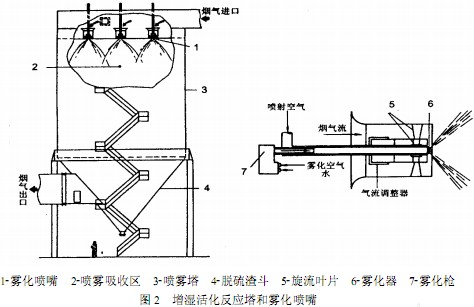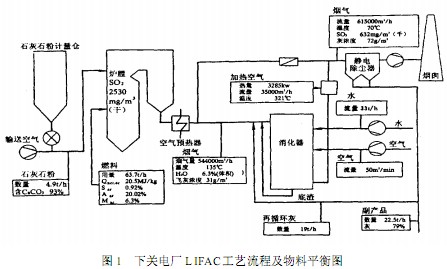 爐內(nèi)噴鈣排煙增濕活化脫硫技術(shù)有投資少、占地少、運(yùn)行費(fèi)用低、無廢水、操作維護(hù)方便等優(yōu)點(diǎn)。對中、小容量燃用中、低硫煤的鍋爐特別適用。對現(xiàn)有機(jī)組進(jìn)行環(huán)保改造時(shí)也可應(yīng)用。此法在國外 ,以芬蘭的 Tempella Power 公司的技術(shù)最典型。國內(nèi)撫順電廠、南京下關(guān)電廠應(yīng)用后效果較好。圖1 是下關(guān)電廠LIFAC工藝流程和物料平衡圖 ,這種方法中的增濕活化反應(yīng)塔和霧化噴嘴示于圖 2 中。與LIFAC基本相似的是美國 Babcock & Wilcox 公司開發(fā)的LIMB 脫硫技術(shù) ,它是屬于爐內(nèi)噴鈣并進(jìn)行分段燃燒的方法 ,此法同時(shí)可降低 NOX ,由于分段燃燒 ,空氣分段供給 ,因此爐溫較L IFAC法低 ,其余和L IFAC相同 ,這種方法在噴鈣 Ca/ S = 2 時(shí) ,脫硫率ηSO2可達(dá) 50 %或更高。