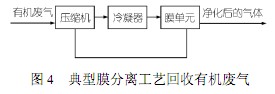 膜分離是選用人工合成的或天然的膜材料為隔障 ,來分離混合氣體或液體的過程。該法是一種新的高效分離方法。用膜分離法可回收的有機(jī)物包括脂肪族和芳香族化合物 ,鹵代烴、醛、酮、腈、酚、醇、胺、酯等。該法最適合處理有機(jī)物濃度較高的廢氣 ,回收效率可以達(dá)到 97 %以上。膜分離技術(shù)的傳統(tǒng)工藝如圖 4 所示。