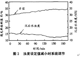 濁度控制回路的調(diào)節(jié)性能的檢測方法是人為地改變沉淀池出水濁度的設(shè)定值,觀察濁度檢測值的變化情況,系統(tǒng)通過調(diào)節(jié)使?jié)岫葯z測值基本穩(wěn)定在新設(shè)定值所需要的時間即為調(diào)節(jié)速度。圖2為當(dāng)沉淀池出水設(shè)定值由15.0NTU調(diào)整為13.0NTU時系統(tǒng)的調(diào)節(jié)情況。從圖2可以看出,在沉后水濁度目標(biāo)值下調(diào)2.0NTU后,絮凝檢測值R開始緩慢上升,這是由于濁度控制器不斷提高絮凝檢測設(shè)定值緣故,而沉后水濁度檢測值在大約40min后開始下降,大約180min后,沉后水檢測值被調(diào)整到了新的目標(biāo)設(shè)定值,這說明濁度控制回路的調(diào)節(jié)時間大約為180min。由于設(shè)定值的變化是以日計,與此相比,系統(tǒng)的調(diào)節(jié)速度是比較迅速的,能滿足生產(chǎn)要求。這說明系統(tǒng)對突然性的干擾具有良好的調(diào)節(jié)能力,滿足生產(chǎn)要求。