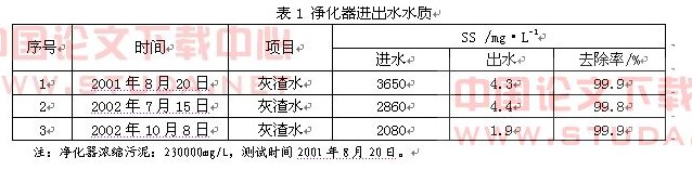 4.1、 1999年10月,南京慧邦科技研究所的第1套用于灰渣水處理的DH高效(旋流)污水凈化器在國(guó)華北京熱電分公司正式投運(yùn)。該廠選用2臺(tái)φ2800mm的DH高效污水凈化器用于120m3/h沖灰渣廢水的處理回用。單臺(tái)處理能力為60m3/h,最大處理能力80m3/h,處理原水為濃縮機(jī)沉淀排出的灰渣水,水質(zhì)濃度SS 2000~3000mg/L,最大濃度SS 10000mg/L,運(yùn)行至今狀況良好。經(jīng)國(guó)華北京熱電分公司測(cè)試,凈化器進(jìn)出水水質(zhì)如表1所示。