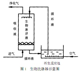 生物洗滌器是一個懸浮活性污泥處理系統(tǒng)由一個吸收室和一個再生池構(gòu)成.其工藝流程見圖1.