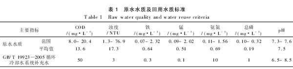 試驗(yàn)原水取自某大型鋼鐵企業(yè)內(nèi)圍廠河。圍廠河以接納該企業(yè)內(nèi)各生產(chǎn)部門處理后達(dá)標(biāo)排放的工業(yè)廢水為主,還包括廠區(qū)內(nèi)的雨水及部分生活污水。試驗(yàn)期間圍廠河水質(zhì)變化情況及回用水質(zhì)標(biāo)準(zhǔn)見表1,COD、氨氮和總磷均已達(dá)到《城市污水再生利用工業(yè)用水水質(zhì)》(GB/T 19923—2005)循環(huán)冷卻水系統(tǒng)補(bǔ)充水水質(zhì)要求。