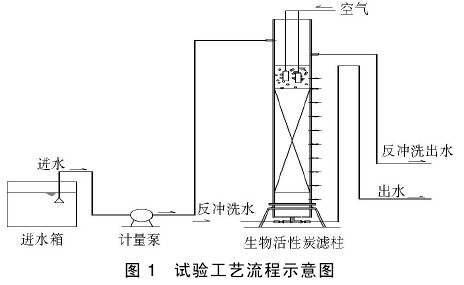 試驗(yàn)裝置主體為生物活性炭濾柱(以下簡稱濾柱),工藝流程示意圖見圖1。濾柱為有機(jī)玻璃材質(zhì),內(nèi)徑150 mm,柱高2 400 mm,柱底裝填100 mm的礫石作為承托層,生物活性炭層高1 200 mm,填料采用Φ1 mm×4 mm的柱狀活性炭。