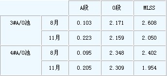 3#、4#A/O池A段和O段DO及MLSS見表1。
