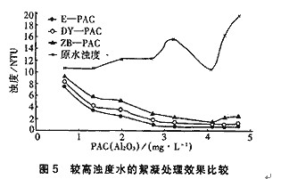 原水濁度為10.5~87.5 NTU時(shí),在3種PAC中,E—PAC對濁度變化的適應(yīng)性最好,在同樣的鋁投加量下,分別比DY—PAC和ZB—PAC對濁度的去除效率高約10%~20%,表現(xiàn)出明顯的優(yōu)越性。