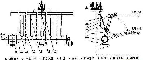 潷水器按其結(jié)構(gòu)形式可分為機(jī)械式、虹吸式、自浮式、簡易式等幾種。目前在國內(nèi)應(yīng)用廣泛的多為旋轉(zhuǎn)式(屬機(jī)械式潷水器的一種)。