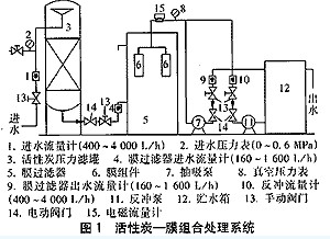 超濾膜過(guò)濾飲用水深度凈化工藝是近年發(fā)展起來(lái)的一種新興工藝,其顯著優(yōu)點(diǎn)是能有效去除水中的病原菌(如賈第蟲(chóng)孢囊、隱孢子蟲(chóng)卵囊和大腸桿菌)。超濾膜對(duì)有機(jī)物的去除率取決于原水水質(zhì)和膜孔的大小,在較大的范圍內(nèi)變化。在超濾膜的應(yīng)用過(guò)程中,最重要的是膜阻塞和膜污染問(wèn)題。水中的有機(jī)物、無(wú)機(jī)物、懸浮固體顆粒、微生物和膠體物質(zhì)等在膜表面和膜孔內(nèi)累積將破壞膜的運(yùn)行性能,并極大地縮短膜的使用壽命;钚蕴颗c超濾膜的組合系統(tǒng)克服了單用任何一種處理手段時(shí)的弱點(diǎn),如活性炭出水中常常含有一定量的細(xì)菌而影響出水的水質(zhì),超濾膜則存在膜阻塞和膜污染的問(wèn)題。在組合系統(tǒng)中,利用活性炭對(duì)進(jìn)水進(jìn)行必要的前處理,如去除水中大部分的濁度、各種類(lèi)型的有機(jī)化合物和色度[1、2],這些物質(zhì)的去除為后續(xù)的膜過(guò)濾提供了必要的保障,從而緩解了膜阻塞和膜污染問(wèn)題,延長(zhǎng)了膜的使用壽命。用膜進(jìn)行后處理有效地解決了出水中含有一定量細(xì)菌的問(wèn)題,保障了出水水質(zhì)。