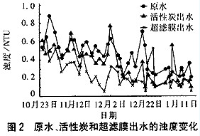 由于原水是北京第三水廠處理后的出水,該中試系統(tǒng)進(jìn)水的濁度相當(dāng)?shù),一般?.3~0.8NTU(冬季基本上維持在0.3 NTU)。經(jīng)活性炭吸附和超濾膜過(guò)濾后,出水的濁度<0.1 NTU,在HACH2100P濁度儀的檢測(cè)限之外(見(jiàn)圖2)。