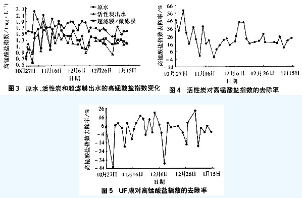 在該工藝中選用的活性炭是RCT14×40型,比表面積為850m2/g。定量測(cè)定活性炭的孔徑分布為:中孔容積0.053cm3/g,微孔容積0.366cm3/g,故中孔容積比普通ZJ-15型炭(0.04cm3/g)大。在液相吸附中發(fā)揮吸附作用的主要是中孔這種過(guò)渡孔,其容積的增大勢(shì)必使RCT14×40型炭對(duì)水中分子質(zhì)量處于中間值、分子表觀尺寸居中的有機(jī)污染物的吸附能力增強(qiáng);钚蕴砍鏊兄饕蠓肿淤|(zhì)量和小分子質(zhì)量的有機(jī)污染物,而UF膜的孔徑在0.03~0.1μm,這對(duì)大分子質(zhì)量的有機(jī)污染物截留作用較強(qiáng),對(duì)小分子質(zhì)量的有機(jī)污染物基本上沒(méi)有去除作用。所以UF膜對(duì)高錳酸鹽指數(shù)的去除率始終維持較低的水平,最高也僅有25%,在運(yùn)行平穩(wěn)后基本維持在10%左右。
