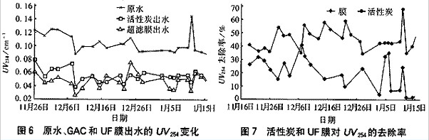 由圖6、7可見(jiàn),活性炭和UF膜對(duì)UV254的去除率平均值分別為20%和40%,UF膜對(duì)UV254的去除率遠(yuǎn)高于對(duì)高錳酸鹽指數(shù)的去除率。UF膜對(duì)UV254去除的有效性和高去除率在國(guó)外的研究中也得到了證實(shí),如LoTan 和Gary L.Amy等人的報(bào)告中介紹膜對(duì)于UV254表示的腐殖酸總有機(jī)碳有近50%的去除率。對(duì)高錳酸鹽指數(shù)與UV254比值的變化關(guān)系進(jìn)行對(duì)比,發(fā)現(xiàn)進(jìn)水為1.9,出水為3.1,表明該系統(tǒng)對(duì)三致物質(zhì)及其前質(zhì)的去除與高錳酸鹽指數(shù)的去除無(wú)正相關(guān)性。