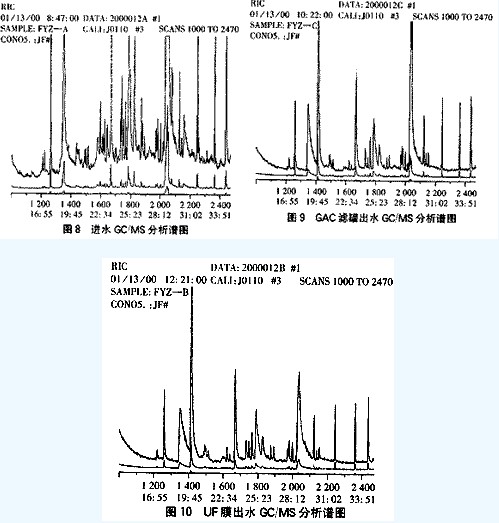 在北京燕山石化總廠飲用水深度凈化現(xiàn)場(chǎng)進(jìn)行的研究結(jié)果表明,該系統(tǒng)能有效地去除水中的高錳酸鹽指數(shù)、UV254和大腸桿菌,尤其是對(duì)腐殖酸和富敏酸以及相應(yīng)的消毒副產(chǎn)物都有較高和穩(wěn)定的去除效果;钚蕴颗cUF膜組合系統(tǒng)對(duì)濁度的去除效果顯著。當(dāng)進(jìn)水濁度在0.3~1 NTU變化時(shí),出水濁度<0.1 NTU或經(jīng)常小于儀器的檢測(cè)限。組合系統(tǒng)中活 性炭對(duì)高錳酸鹽指數(shù)的去除率在20%左右,UF膜對(duì)高錳酸鹽指數(shù)的去除率在10%左右,并且受進(jìn)水水質(zhì)的影響比較顯著。組合系統(tǒng)對(duì)UV254的去除率較高,活性炭對(duì)UV254的去除率在20%左右,UF膜對(duì)UV254的去除率在40%左右。這在一定程度上表明,膜對(duì)腐殖酸、富敏酸和與之相應(yīng)的消毒副產(chǎn)物的去除率較高,即膜是一種去除水中三致物質(zhì)及其前質(zhì)的較有效手段之一,而且這一去除率與高錳酸鹽指數(shù)的去除率呈正相關(guān)。GC/MS分析結(jié)果顯示,經(jīng)活性炭吸附后約61.6%的有機(jī)污染物被去除,經(jīng)UF膜過(guò)濾后有26.5%的有機(jī)污染物被去除,對(duì)烷烴有機(jī)污染物的去除率較高,有些有機(jī)物雖然沒(méi)被1 00%去除(如苯酸酯在活性炭和UF膜出水中均被檢出),但其濃度比進(jìn)水明顯降低,總譜峰面積從進(jìn)水的4752919減少到活性炭出水的1826441和UF膜出水的1342992。選用孔徑為0.03~0.1μm的超濾膜,利用截留能完全去除水中細(xì)菌和致病原生動(dòng)物,在整個(gè)水廠正常運(yùn)行期間的出水中始終未檢出大腸桿菌。