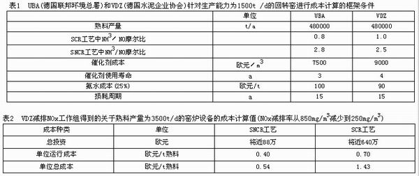 根據文獻中熟料產量為1500t/d的回轉窯的使用過程.VDZ計算時最初考慮了三種不同的NOx減排率:1200→800 mg/m3 ,1200→500mg/m3,1200→200mg/m3。在這三種情況下,“減排NOx”工作組計算出來的成本明顯高于文獻中SCR上巳的成本。