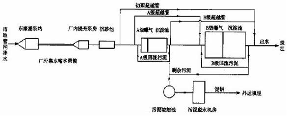 污水經(jīng)過A級處理系統(tǒng),能去除一部分BOD5,調(diào)節(jié)后再進(jìn)入B級曝氣池,減輕了B級活性污泥的污染物負(fù)荷,同時穩(wěn)定了B級進(jìn)水水質(zhì),從而保證了B級微生物凈化水質(zhì)的效果。一般B級污泥負(fù)荷較低(Ns=0.15——0.3kg BOD5/kgMLSS·d),停留時間為2——5小時。以廣州市獵德污水處理廠為例,AB工藝處理城市污水的流程如下: